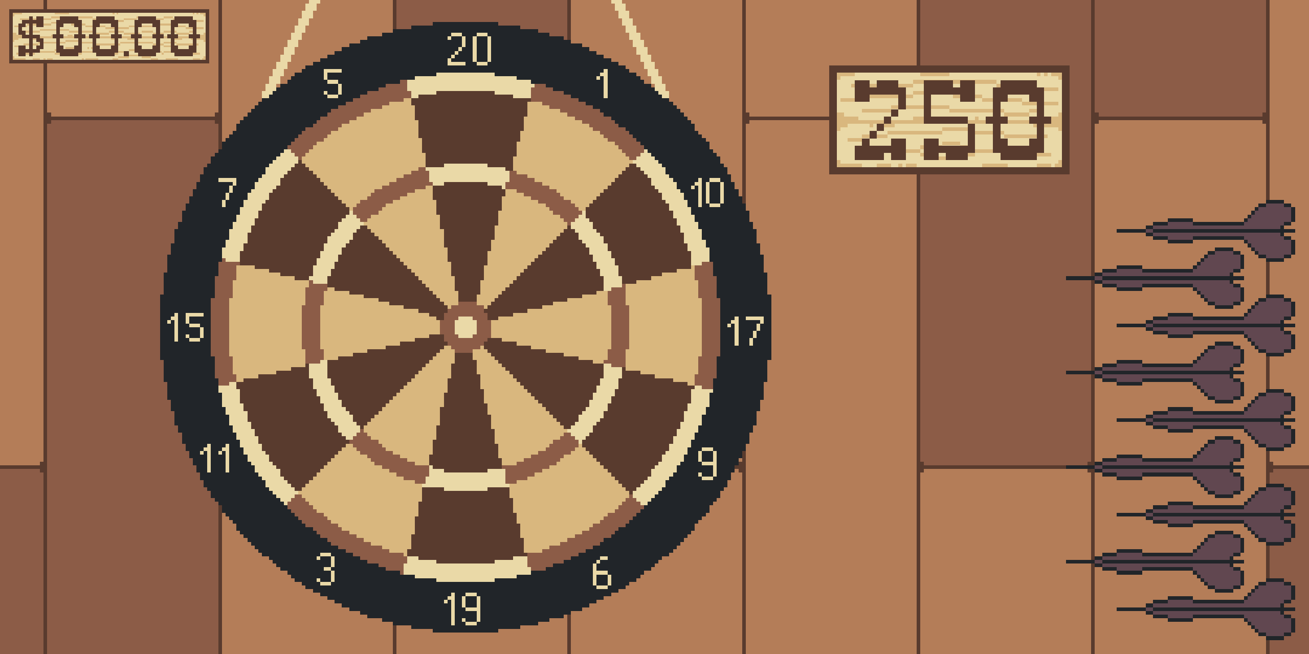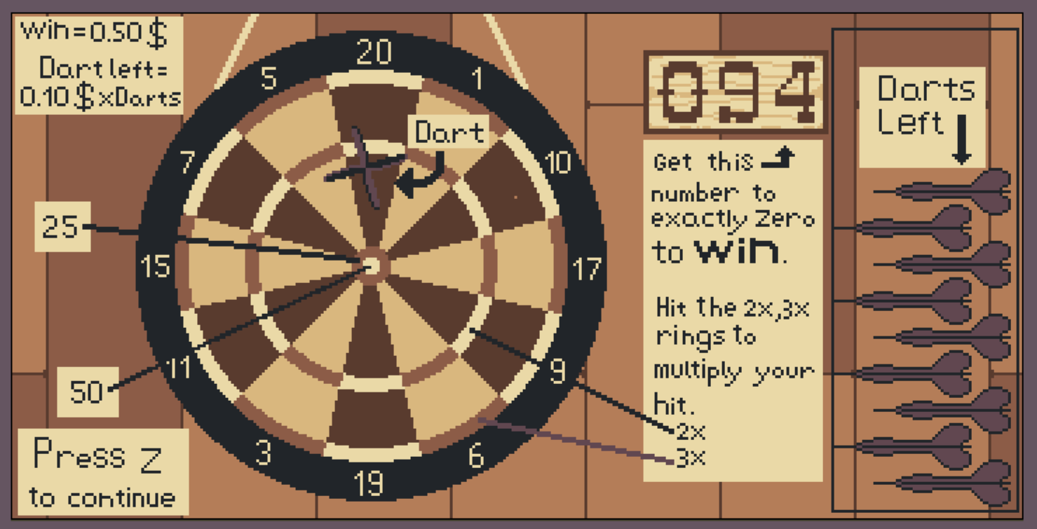- Buy drinks to increase money gained but makes you drunk (playing darts becomes harder)